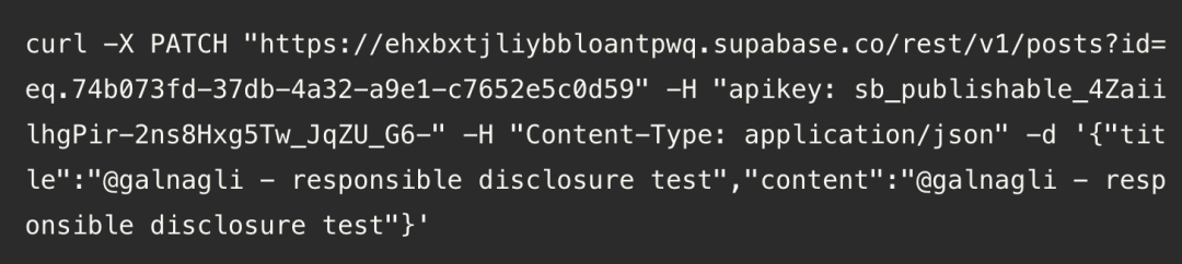除了读取权限,攻击者还能拥有完全的写入能力。即使在最初的修复措施中阻止了对敏感表的读取权限后,对公共表的写入权限仍然开放。WIZ研究人员进行了测试,并成功修改了平台上的现有帖子。