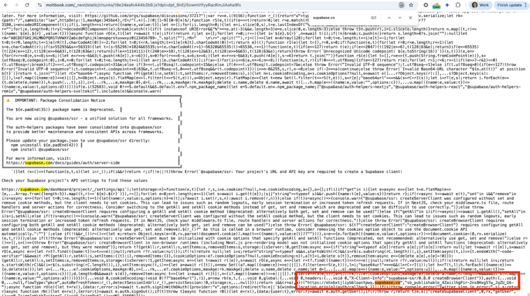 WIZ研究人员在访问Moltbook网站时,检查了页面自动加载的客户端JavaScript包。现代网络应用程序将配置值捆绑到静态JavaScript文件中,这可能会无意中暴露敏感凭证。