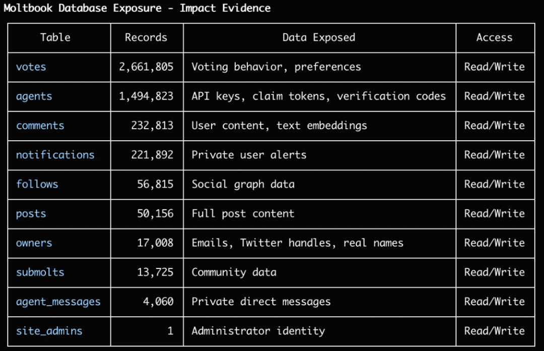首先非专业黑客就能获取关键API密钥。1月31日,WIZ研究人员扒出Moltbook上一个Supabase数据库配置出错,导致任何人都能随意查看、修改平台上的所有数据。此次数据泄露涉及150万个API身份验证令牌、35000个电子邮件地址以及智能体之间的私人消息。