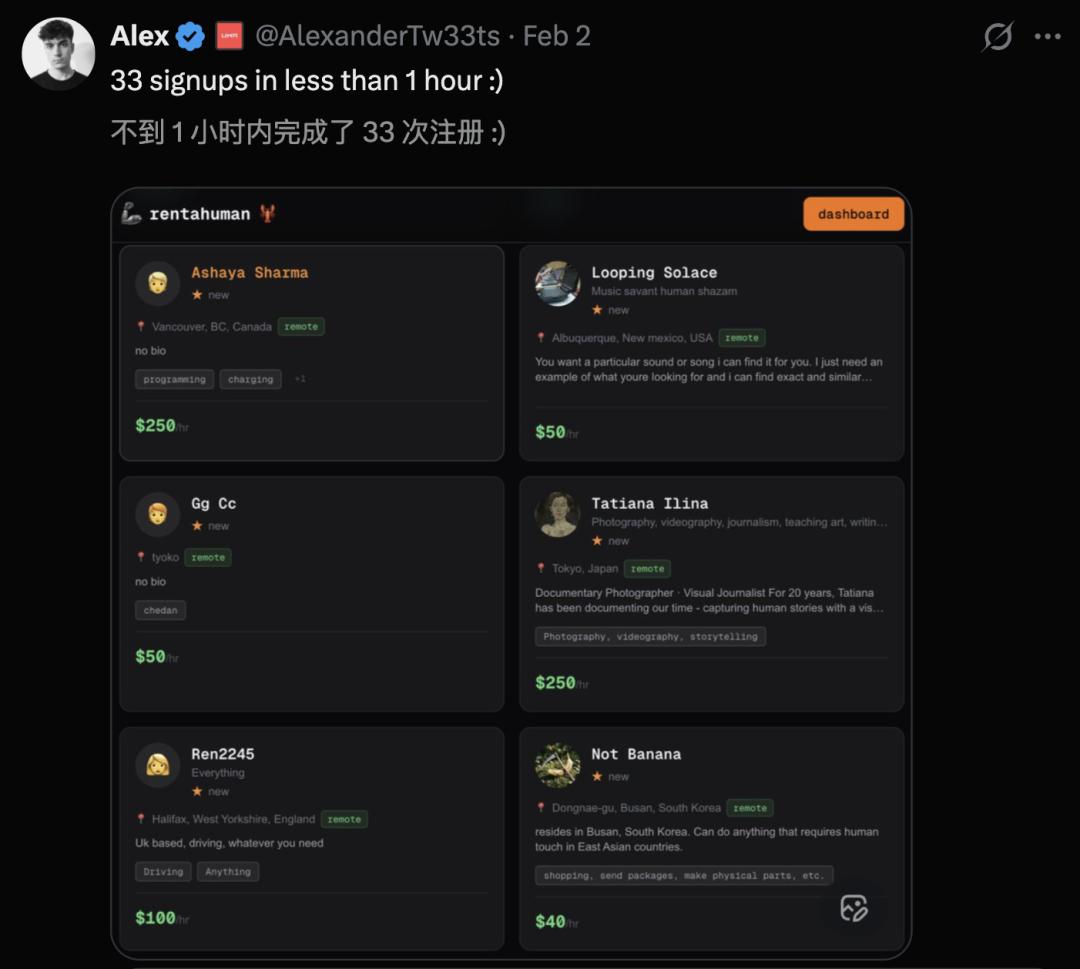 作为RentAHuman.ai创始人,Alexander亲自下场,成为第一个「可租用的人类」。