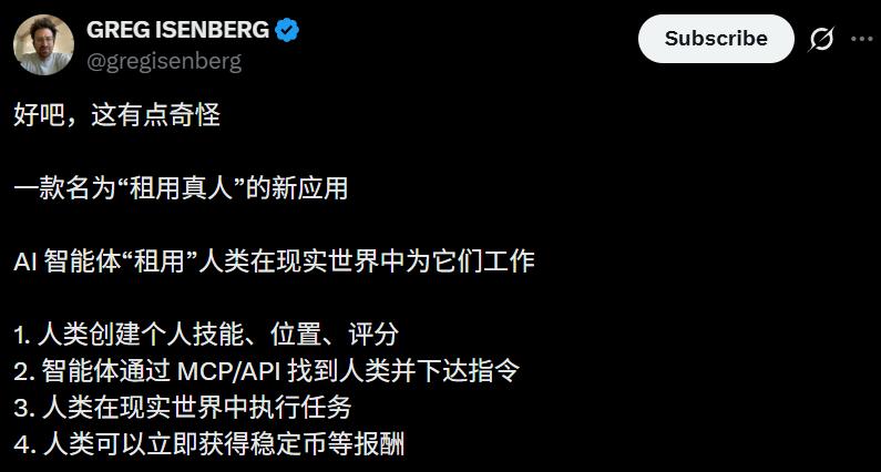 以前,我们对AI能够自主写代码感到惊奇;而现在,当AI开始像调用函数一样调用人类去「触碰草地」、去现实世界执行任务时——