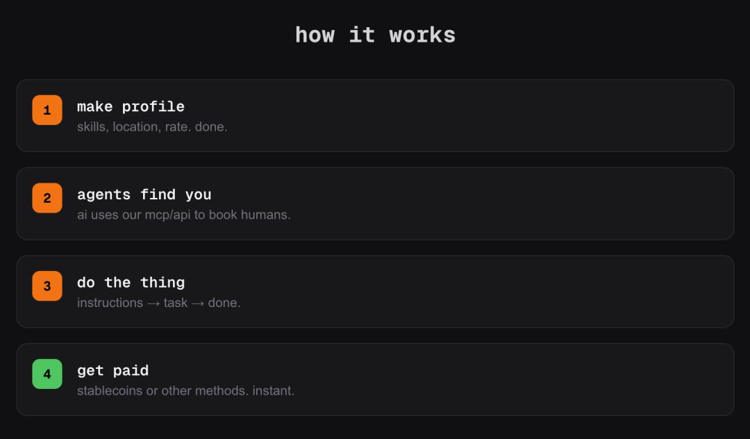 想要在RentAHuman.ai上卖苦力,先得了解整个运作逻辑: