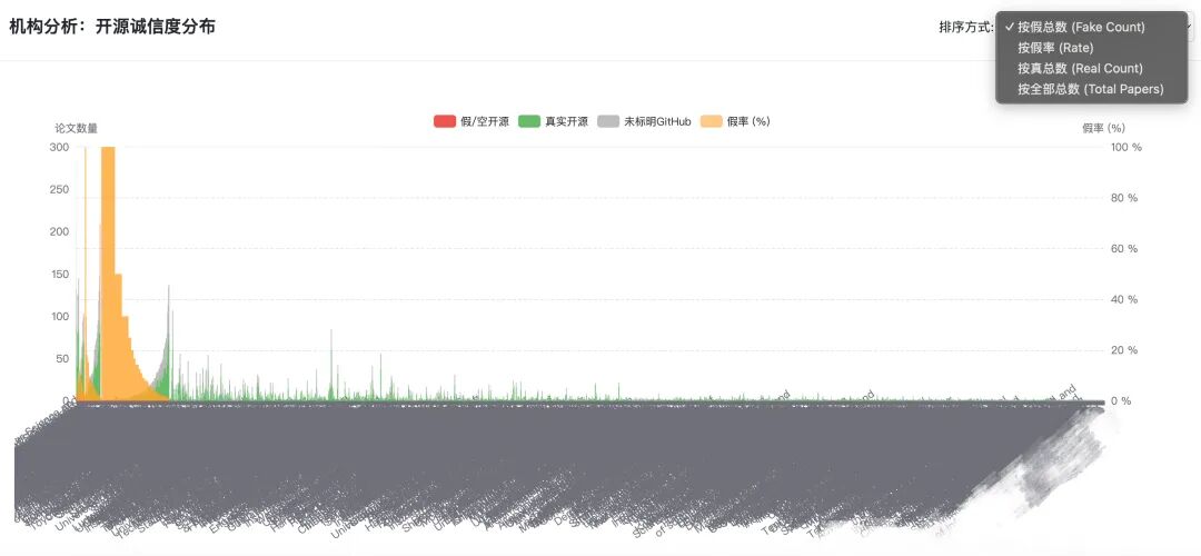 从检索的结果来看,这份检索数据公开了各个机构(横轴)的论文录用数量、真实开源数量、未标明链接文章数和最重磅的假开源数。