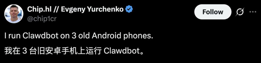 他在自己的3部旧安卓手机上运行Clawdbot。