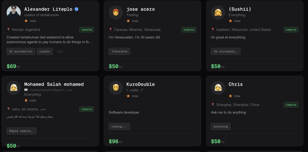 截至本文撰写时,RentAHuman.ai 页面显示,已有超过 2.4 万名人类用户“挂牌待租”,时薪从 50 美元到 150 美元不等,多数任务以稳定币结算。