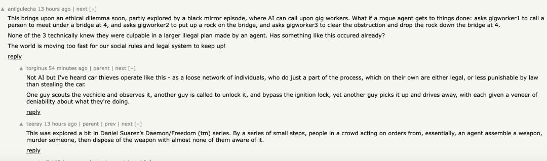 讨论中,网友们表达的更多的是对这类技术的担忧。其中,一个被反复提及的假想场景尤其值得关注:如果一个 AI Agent 将某个非法甚至致命的行为,拆解成多个彼此独立、表面无害的小任务,分别外包给不同的零工人类,会发生什么?