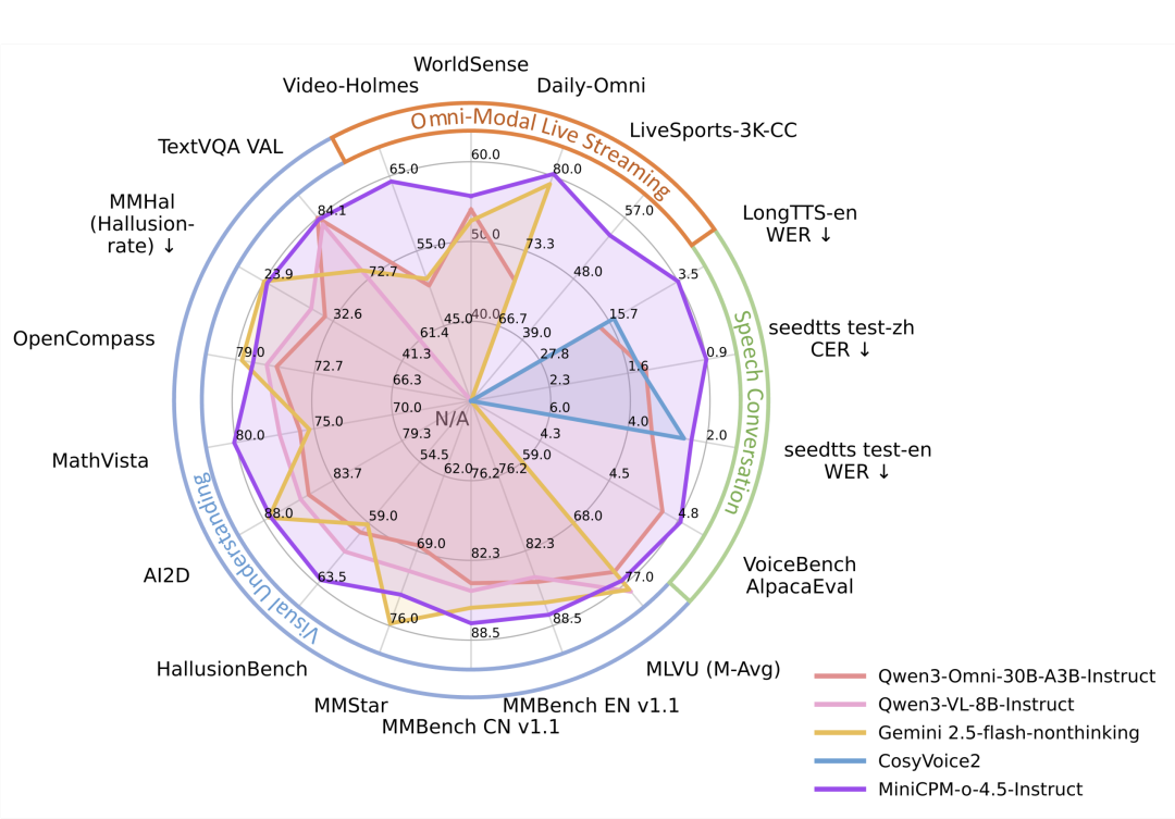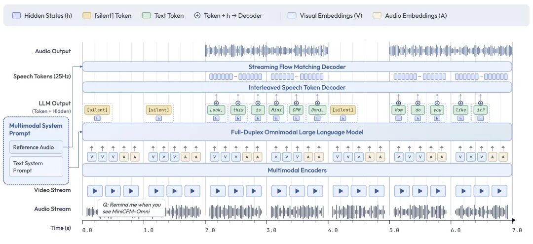 MiniCPM-o 4.5 采用了端到端的全模态架构,并加入了全双工多模态实时流机制、主动交互机制、可配置语音建模设计。