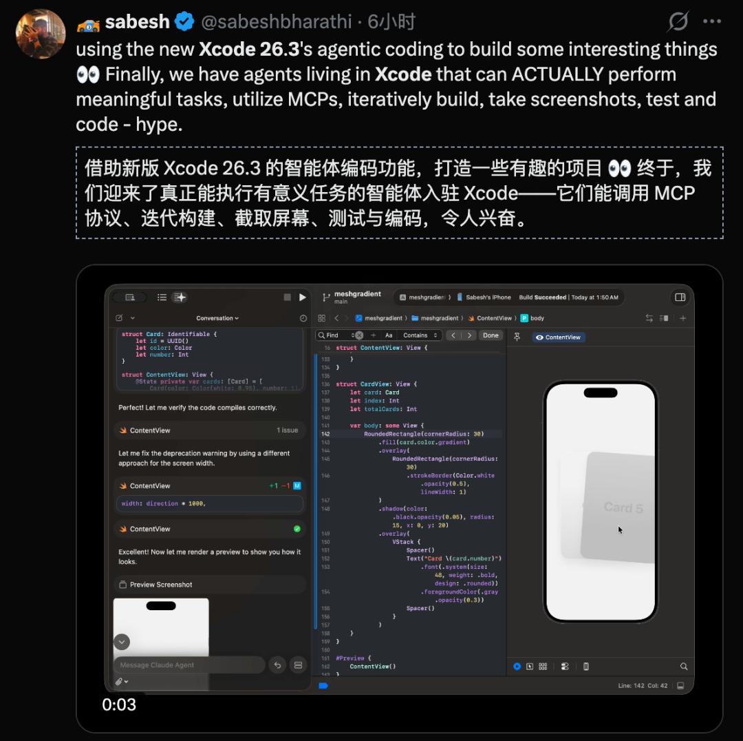 有人激动得凌晨发推:「终于不用在三个窗口之间来回切换了!Xcode+Claude+文档,现在全在一个界面里。」