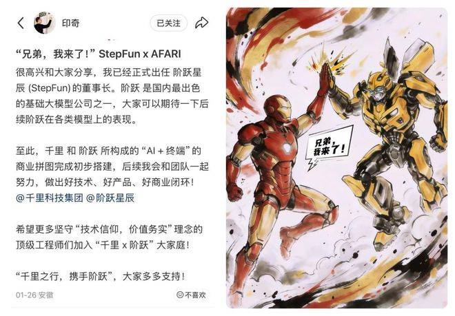 1月26日,“AI老兵、旷视科技创始人、千里科技董事长”印奇,正式出任阶跃星辰董事长。其在社交媒体上的表态也透露出一个明确信号:这并非一次象征性的挂职,而是一次实质性的战略介入,标志着阶跃星辰自成立以来,最重要的一次能力重组开始启动。