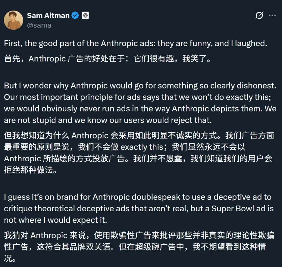 他并没有否认OpenAI要加广告,而是指责Anthropic虚伪。