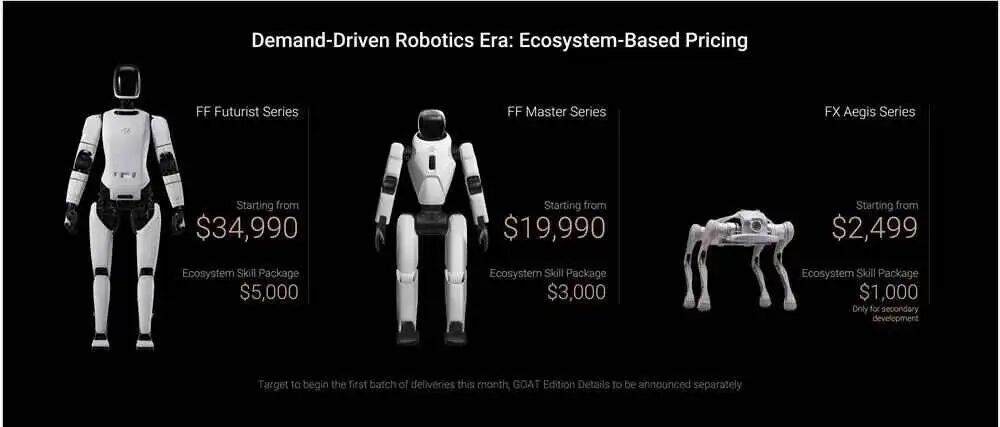 其中,全尺寸人形机器人Futurist(未来主义者)系列被FF定义为“职业型具身智能人形机器人”定价34990美元起(约合人民币24.2万元),另外还可选装生态技能包价格为5000美元。
