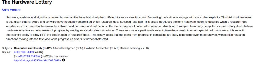 Hooker曾在谷歌DeepMind从事研究工作,自那时起,她就以反对AI领域“规模至上”的主流观点而知名。她在2020年发表的论文《硬件彩票(The Hardware Lottery)》提到,AI创新理念能否成功,往往取决于是否适配现有硬件条件,而非其自身价值。