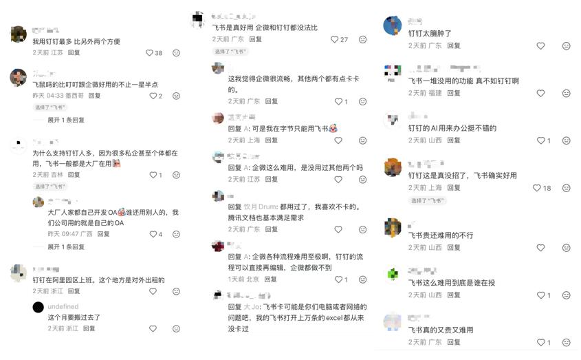 有的网友觉得飞书的好用是企微和钉钉无法比较的,有的认为企微相对流畅,其他两个都有卡顿,还有的网友认为钉钉比较方便,说法各有优劣。