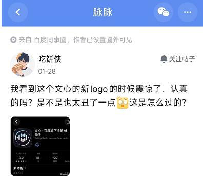 在脉脉平台上,一位百度员工直言不讳:“我看到这个文心的新logo的时候震惊了,认真的吗?是不是也太丑了一点,这是怎么过的?”