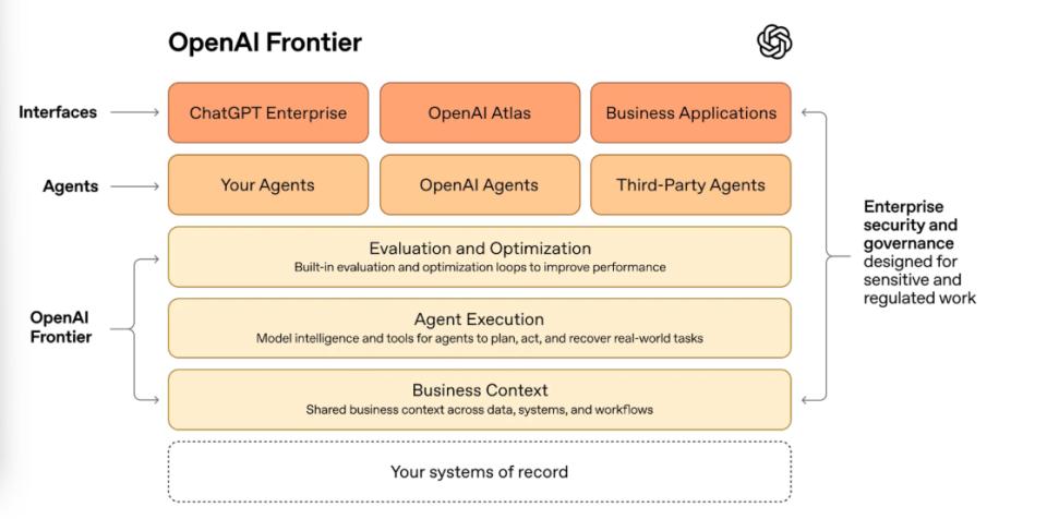OpenAI对Frontier的描述,听起来像在打造一套AI界的人力资源管理系统。“Frontier赋予智能体在工作场所取得成功所需的相同人类技能:共享背景、入职培训、带反馈的实践学习,以及清晰的权限和边界,”OpenAI在一篇官方博文中写道。