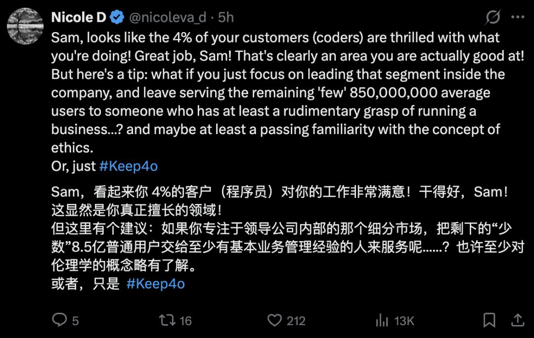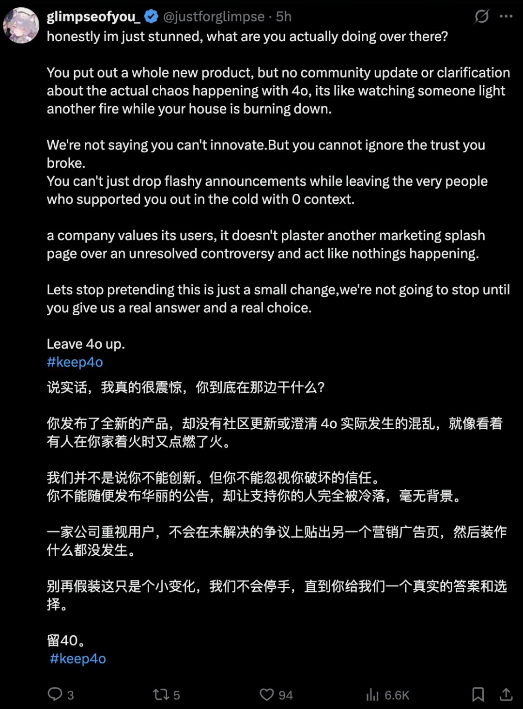 直到现在,奥特曼依然没有回应4o被彻底下架这件事。