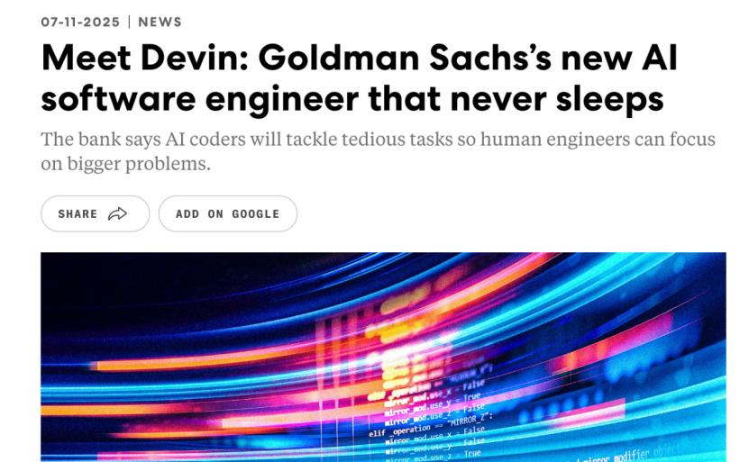 彼时,Devin被宣传为全世界第一位AI程序员。那年的7月,高盛引入了Devin,新闻稿称“高盛新入职的AI程序员从不睡觉”。