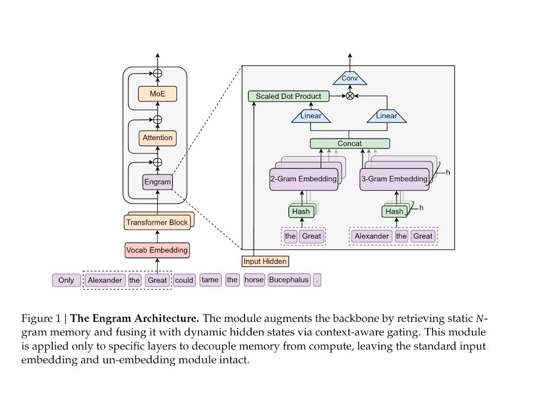 DeepSeek V4 虽然还没发布,但在 1 月刚刚发布了一篇关键论文,提出了全新的「Engram 条件记忆」机制,能在计算量较 MoE 减少 18% 的情况下,在 32768 个 token 的长上下文任务中,反超同参数量的 MoE 模型。