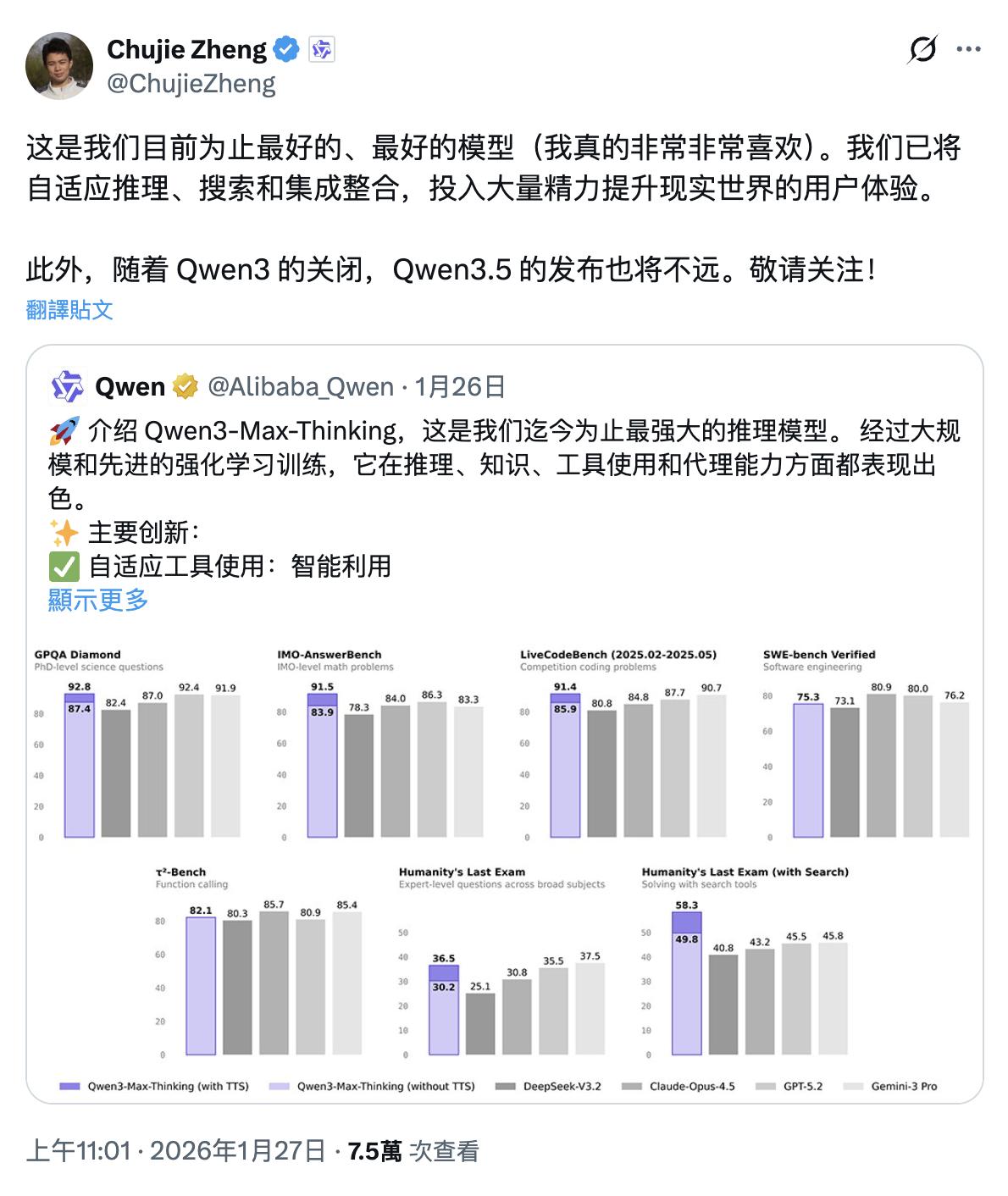 但这一切还是刚开始,阿里 Qwen 研究员郑楚杰在 Qwen3-Max-Thinking 发布时强调这是 Qwen 迄今为止最好的模型,同时又透露「Qwen 3.5 的发布也指日可待」。