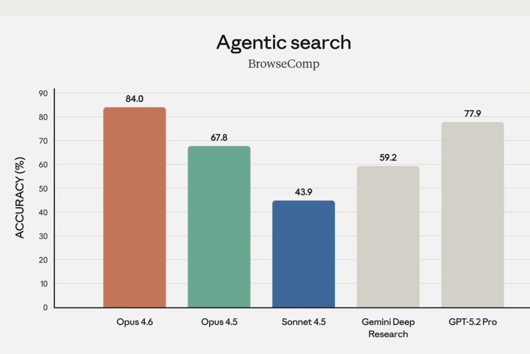 在BrowseComp评测(评估在线检索难获取信息的能力)中,Opus 4.6排名行业第一,深度多步骤代理式搜索表现最佳,能精准定位分散在长文档中的关键信息。