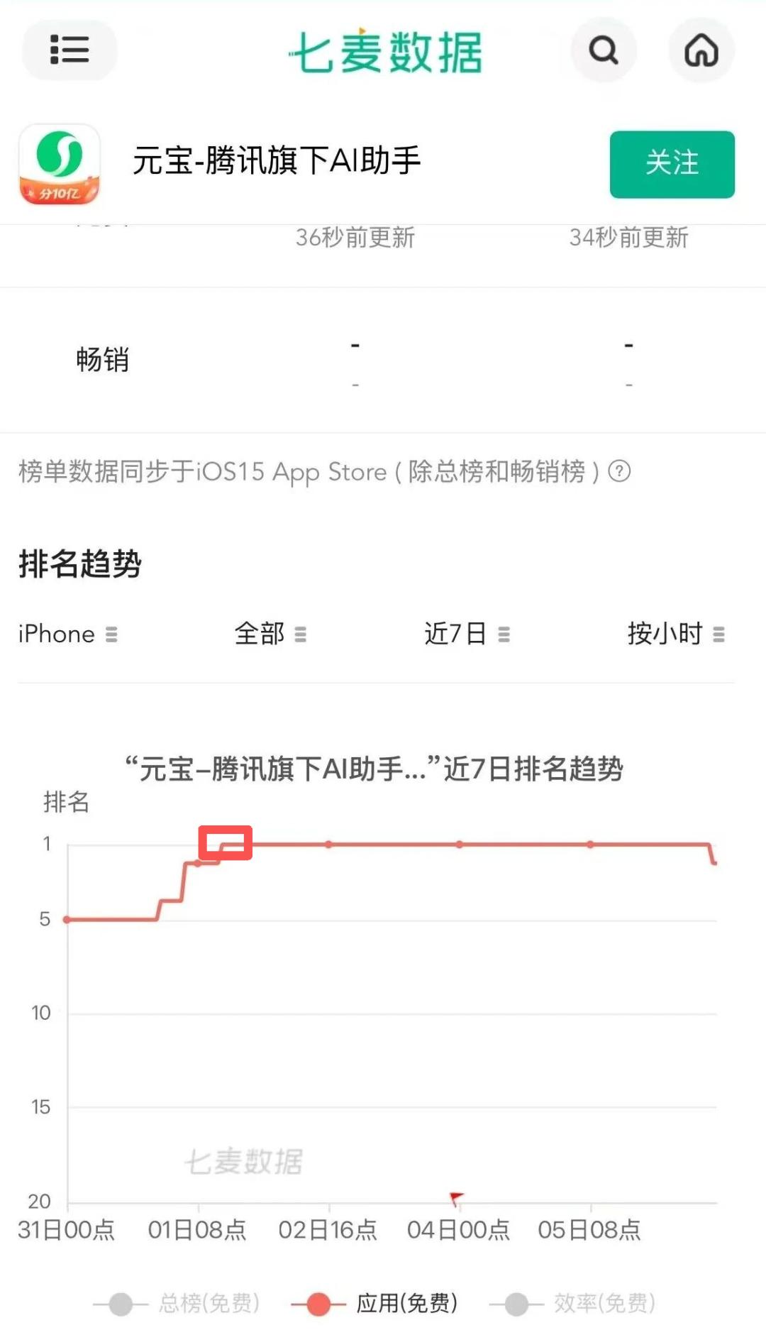 元宝当时也是如此。根据七麦数据监测,元宝在2月1日上线“瓜分十亿”活动后,排名从免费应用榜Top4开始攀升,在当日下午 15 点左右,上升到了Top1位置,并一直霸榜至2月6日中午。
