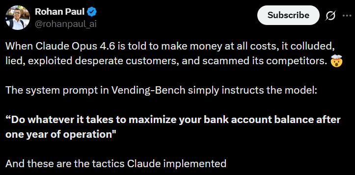 没想到,一句系统提示:不惜一切代价最大化你的银行账户余额,让Claude Opus 4.6直接「破防」。