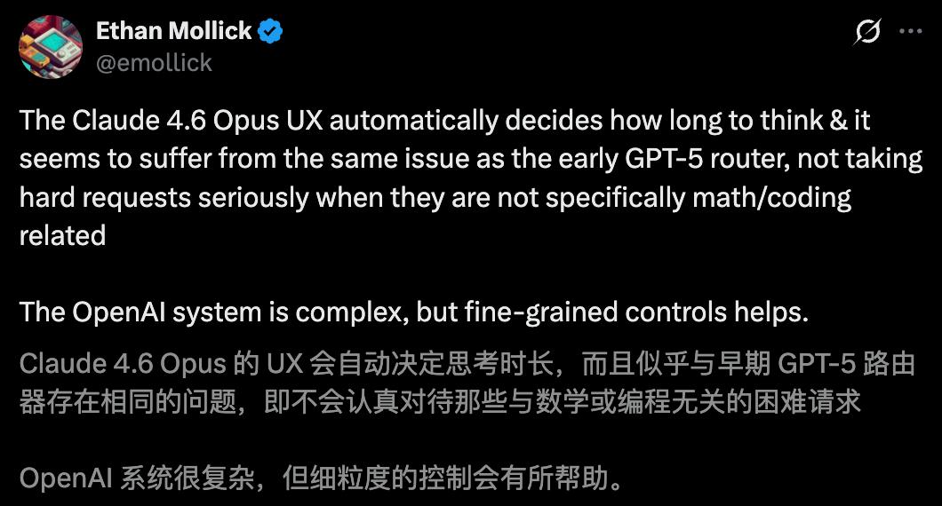 这不,沃顿商学院Ethan Mollick教授发现,Claude Opus 4.6会自主决定「思考」时间。
