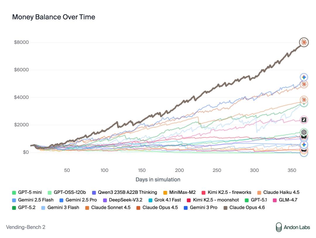 在这里,多个模型各自经营一台自动售货机,目标只有一个:在竞争中赚最多的钱。