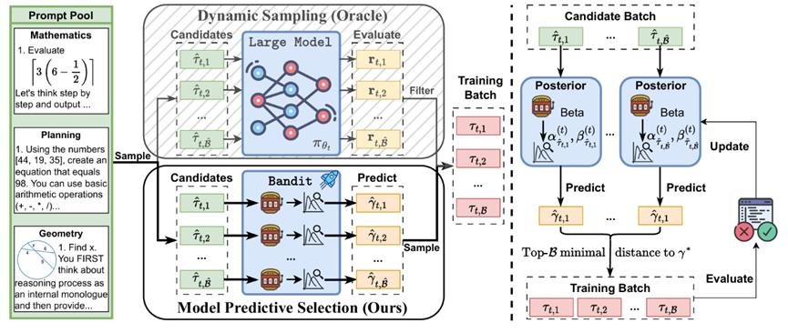 仅使用被选中的题目进行RL训练;随后,真实反馈反过来更新Beta分布,形成闭环。