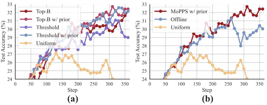 △ (a) MoPPS可以使用不同的筛选策略,并可以结合先验知识提升效果。*(b) 在线问题筛选效果强于离线筛选