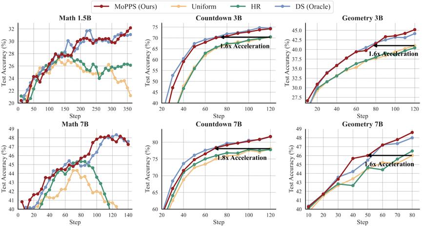 相较于传统的“题海战术”(Uniform采样),MoPPS总能为模型挑出最关键的题目,训练过程被大大加速。实现了高达1.6倍至1.8倍的训练加速,且训练效果更好。