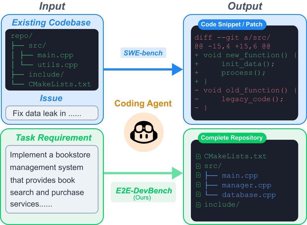 现有基准测试如HumanEval、MBPP聚焦于函数级代码生成,SWE-bench关注issue修复,但真实软件工程需要的远不止这些。当开发者使用Cursor或GitHub Copilot进行“vibe coding”时,他们期望智能体能够:从零设计系统架构、创建和组织多个源文件、配置依赖和构建系统(如CMakeLists.txt)、最终交付一个可编译运行的完整项目。