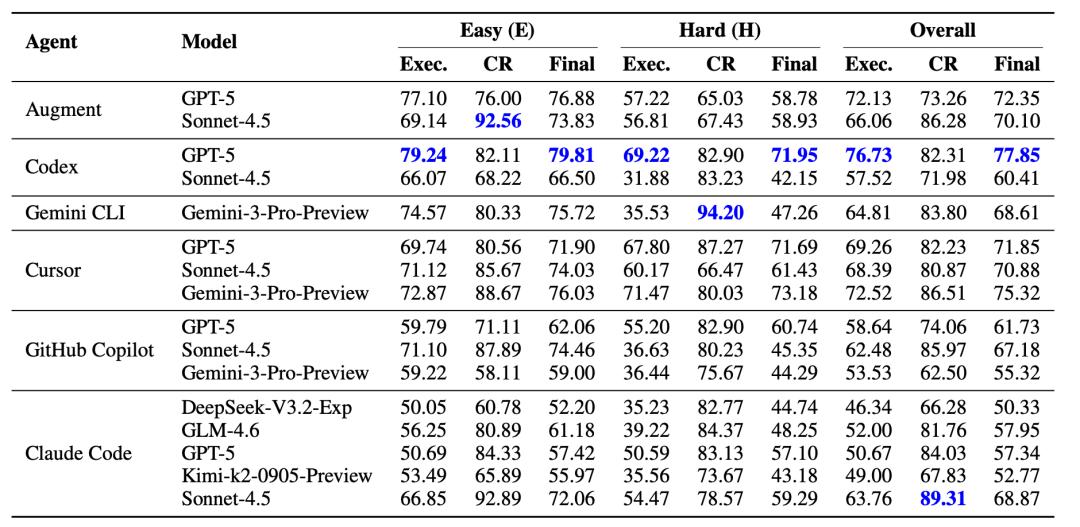 研究团队评估了六种主流编程智能体:Cursor、GitHub Copilot、Claude Code、Augment、Codex CLI、Gemini CLI,搭配GPT-5、Claude Sonnet 4.5、Gemini 3 Pro等前沿模型。