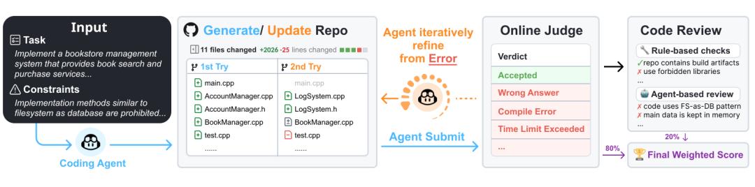 提出首个端到端提供细粒度反馈的项目开发基准,要求智能体从零构建完整可运行的软件仓库