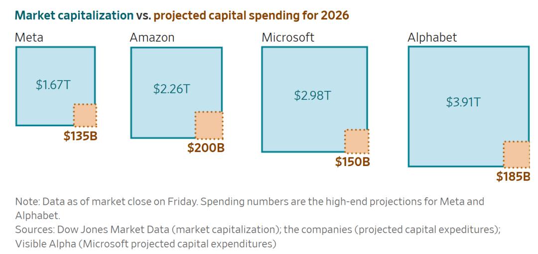 ▲公司市值与资本支出对比,蓝色部分为公司总市值,黄色部分为2026年资本支出,Meta目前资本支出与总市值比例最高,图源:华尔街日报