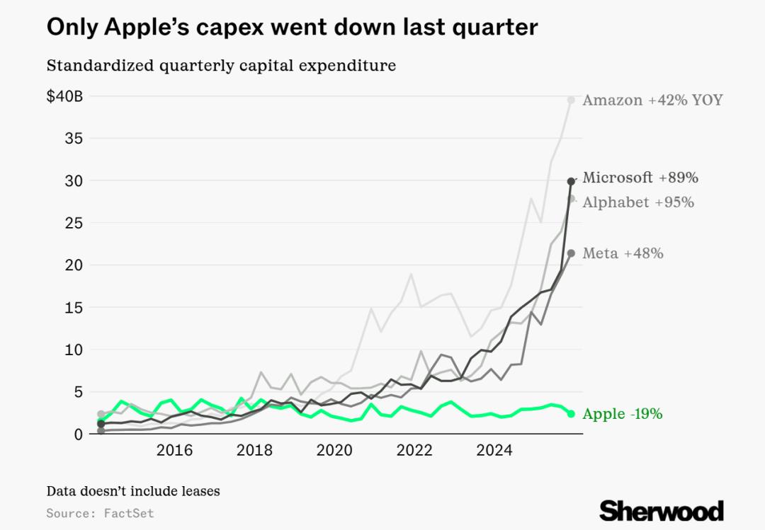 ▲亚马逊、微软、谷歌、Meta、苹果季度支出曲线,图源:Sherwood