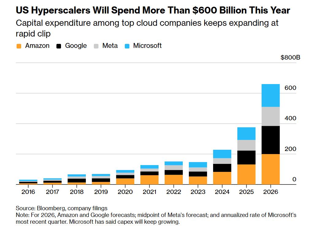 2026年,Meta、亚马逊、微软、谷歌四家美国科技巨头计划在AI基础设施建设方面支出的资本或超过6000亿美元(约合人民币41567亿元),相比去年暴涨了70%以上,预测数据在6300亿美元到6700亿美元之间浮动。