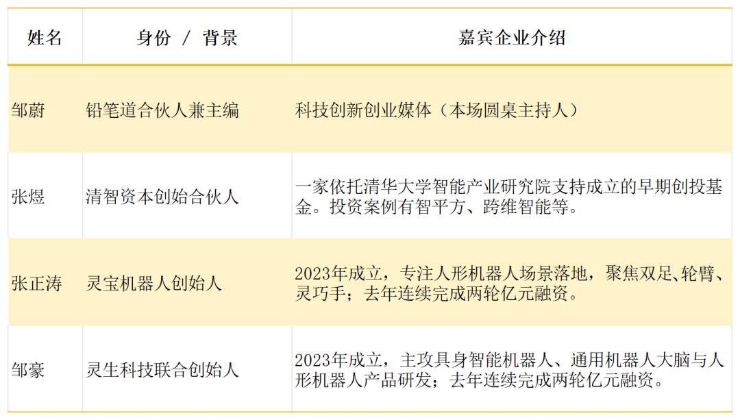 参与讨论的嘉宾包含:1位长期关注人形机器人的投资人,2位人形机器人创业家(见下表)。