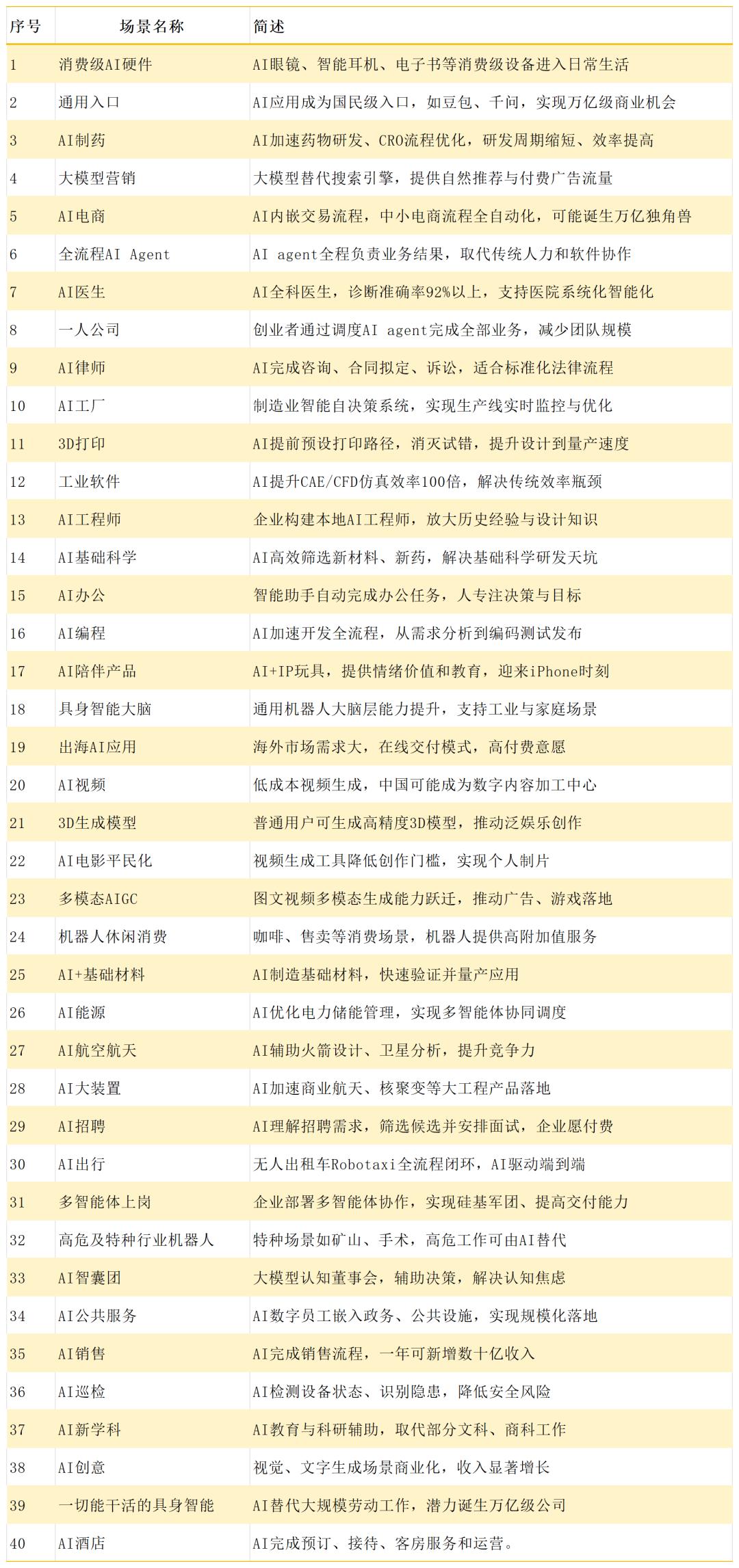 基于这些一线判断,本文系统梳理了2026 年最有可能跑出来的40个AI应用场景——它们有的已经开始产生收入,有的正在跨过关键拐点,也有的正在重塑一个行业的底层逻辑。