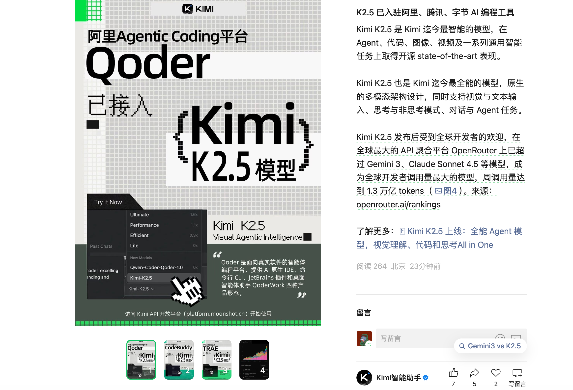 根据官方披露,Kimi K2.5在全球API聚合平台OpenRouter上的周调用量已达1.3万亿tokens,调用量超过Gemini 3、Claude Sonnet 4.5等模型。该版本同时支持对话与Agent任务模式,目前已面向开发者开放使用。