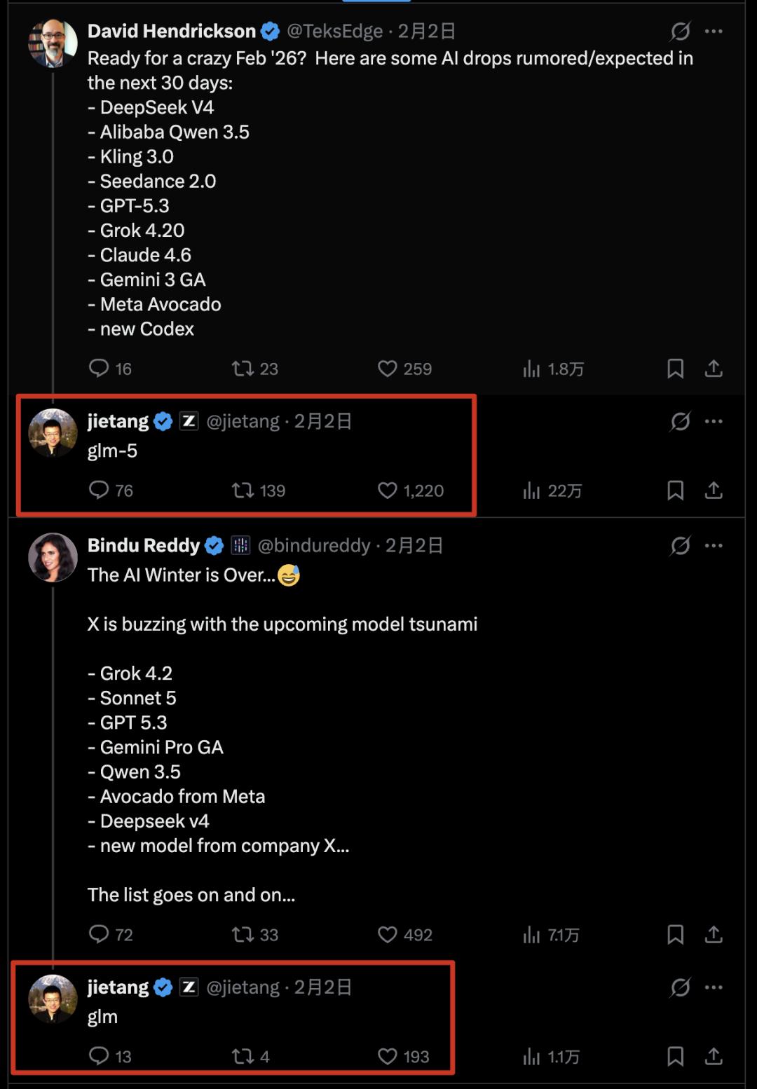 而在同一时间段,DeepSeek新模型、Qwen 3.5、MiniMax M2.2等模型也都有消息将发布更新。