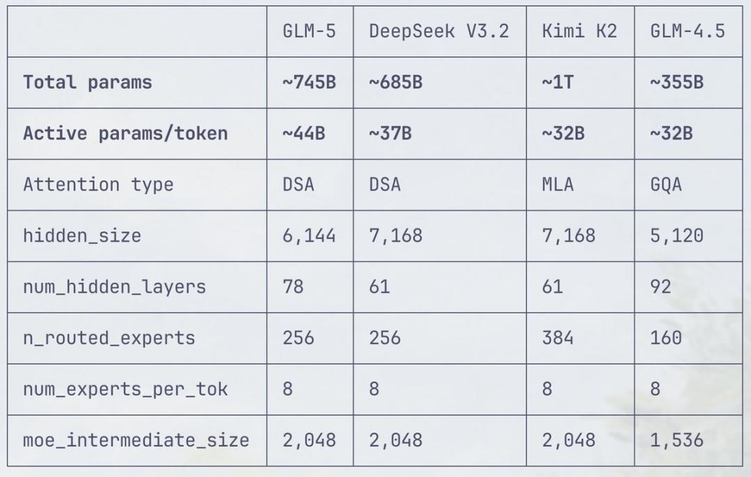 GLM-5采用了DeepSeek-V3/V3.2架构,包括稀疏注意力机制(DSA)和多Token预测(MTP),总参数量745B,是上一代GLM-4.7的2倍。