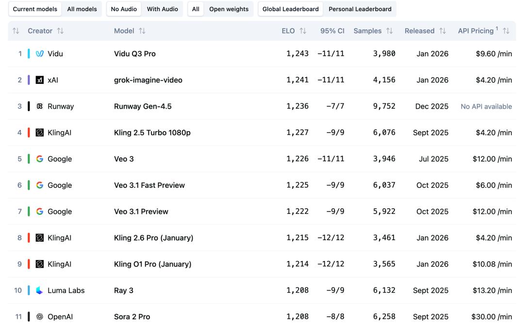 在全球AI文生视频模型性能排行榜Artificial Analysis Text to Video Leaderboard上,Gen-4.5目前排名第三,仅次于生数科技的Vidu Q3 Pro、以及xAI的grok-imagine-video,超过了谷歌Veo 3、OpenAI Sora 2 Pro、快手可灵2.5 Turbo等模型。