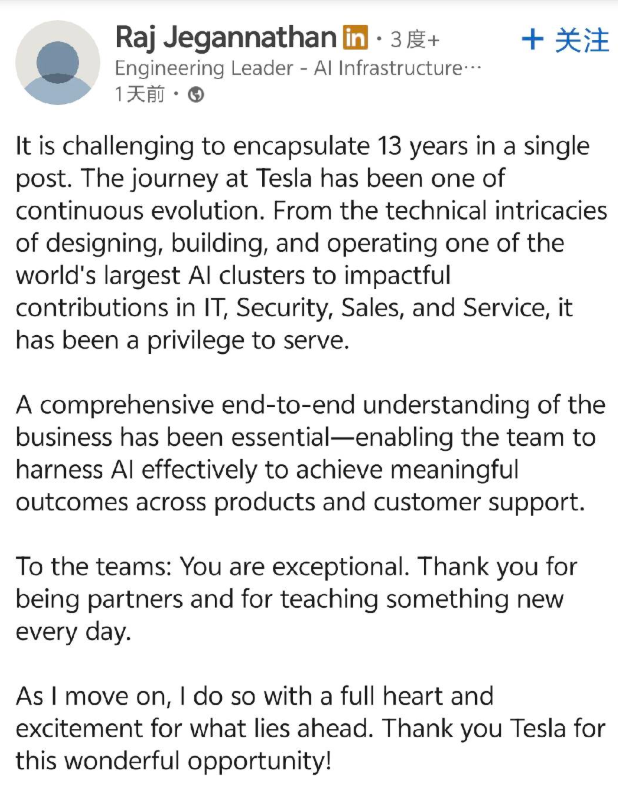 杰根纳坦最近在领英发文,表示自己将从特斯拉离职。