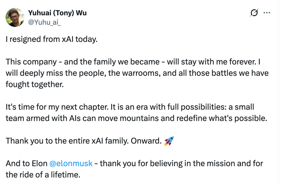 另一边,其名下的大模型公司xAI两天走了3个联创,多名员工发文表示离职,其中有多个华人。