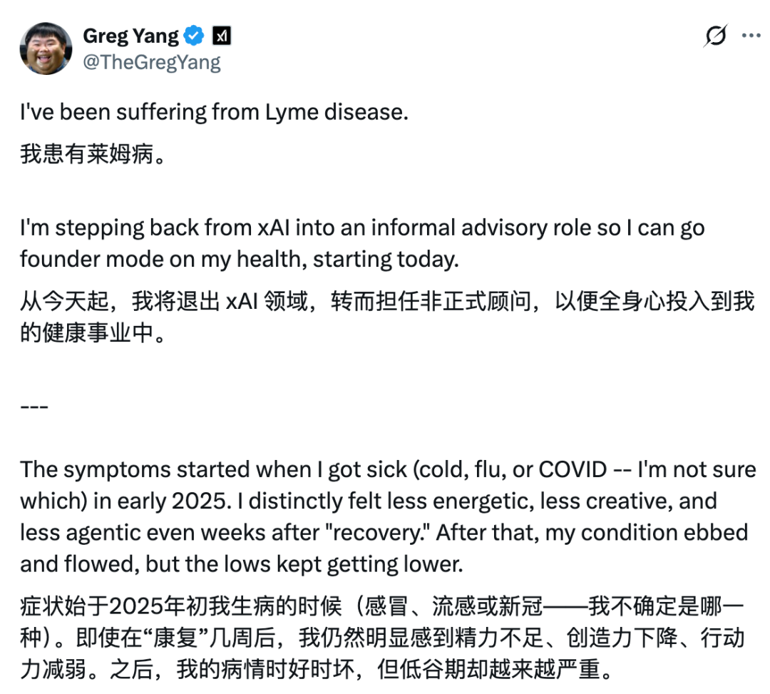 不过,在SpaceX和xAI合并前,xAI就出现了人才流失的情况。1月底,xAI联合创始人杨恪在社交平台发文称,其患有莱姆病,已影响到正常生活,因此他将退出xAI,转任非正式顾问。