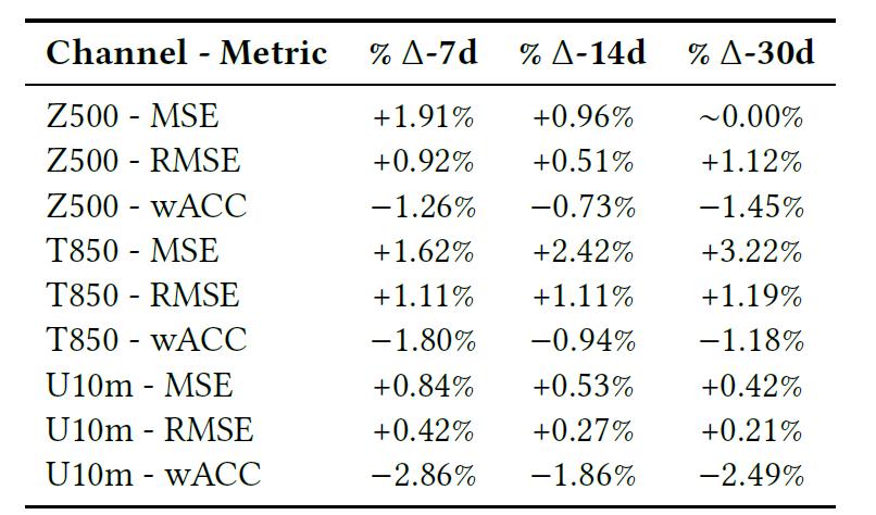 下表则展示了模型在 7、14 和 30 天预测任务上的最终对比,包括 RMSE、MSE 以及 Pearson 相关系数(即 wACC)