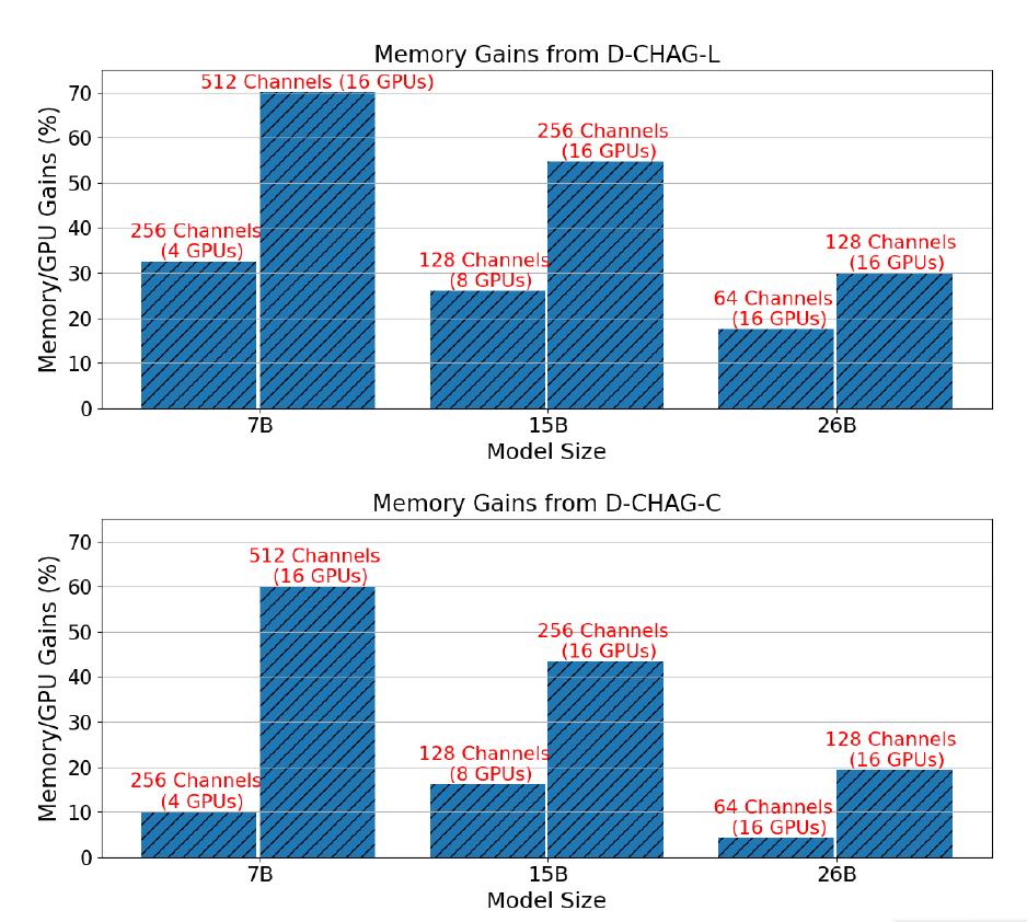 * 与仅使用 TP 相比,D-CHAG 可实现最高 70% 的内存占用降低,从而支持更高效的大规模模型训练