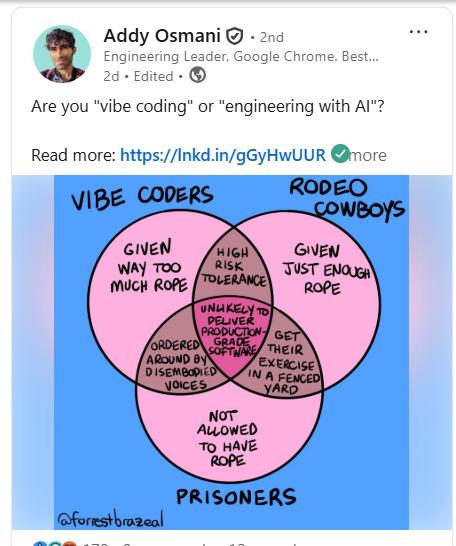 比如,爱尔兰软件工程师、谷歌 Gemini 开发者(同时也在参与 Chrome 的开发) Addy Osmani 就曾公开表达了对 Vibe Coding 不信任。