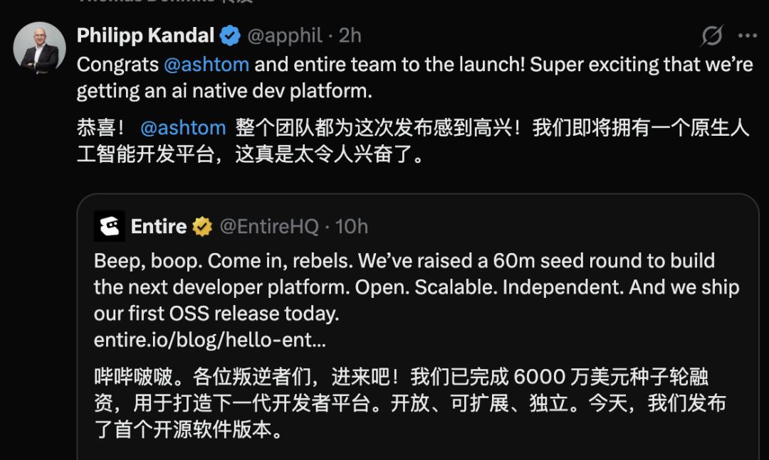 据 Dohmke 介绍,Entire 是一个平台,但它未必会与 GitHub 展开竞争。Dohmke 表示,其理念是在技术栈的更高层构建一个平台,让开发者能够管理智能体的推理过程并与之协作。代码仓库仍将是其中的核心。